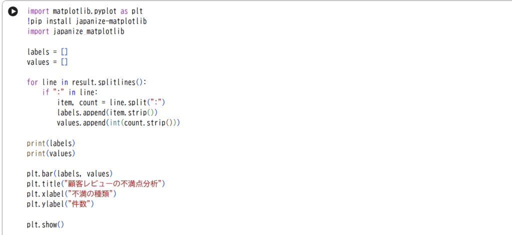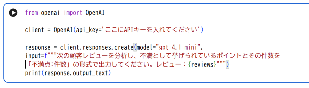 このコードでは、レビューの文章をAIに渡し、「不満点をまとめてください」という指示を出しています。
