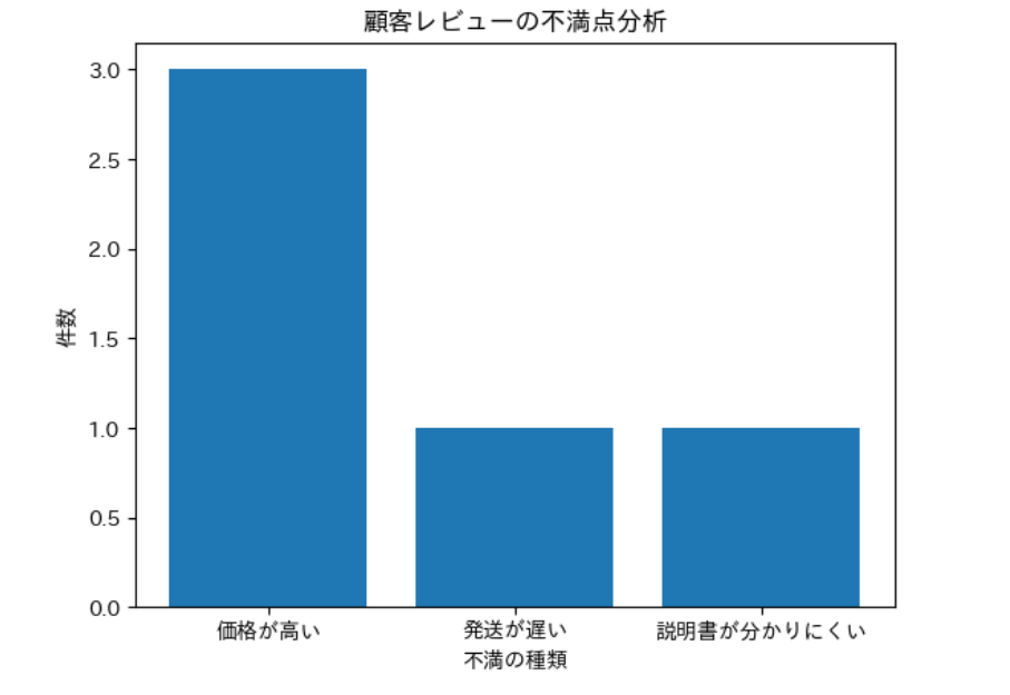 ここでは、先ほどAIが抽出した不満点を例として、簡単な棒グラフを作ってみます。