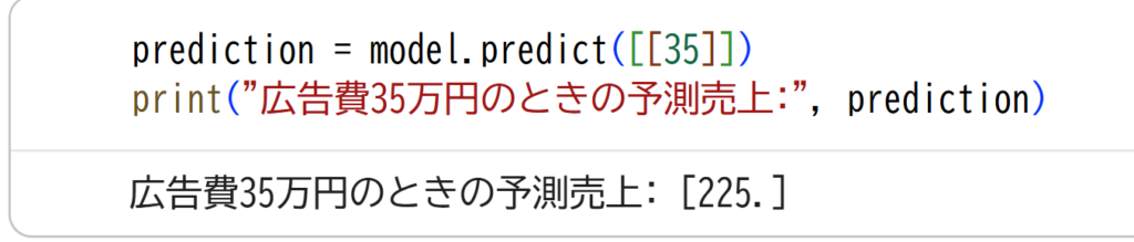 ここでは、学習した式を使って新しい値を予測しています。これで予測値が表示されます。