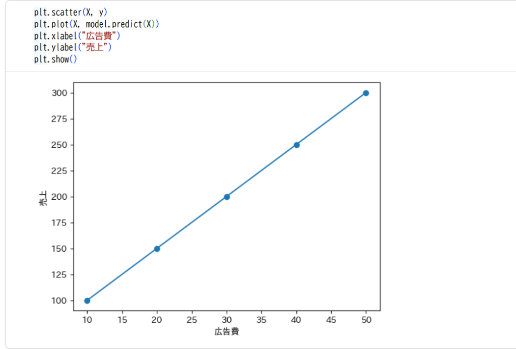 ここで機械学習が行われています。モデルは、売上 = a × 広告費 + b という式の「a」と「b」を自動で計算しています。